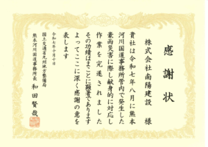 この度、令和7年8月に発生した熊本豪雨災害における支援活動について、国土交通省九州地方整備局より感謝状をいただきました。