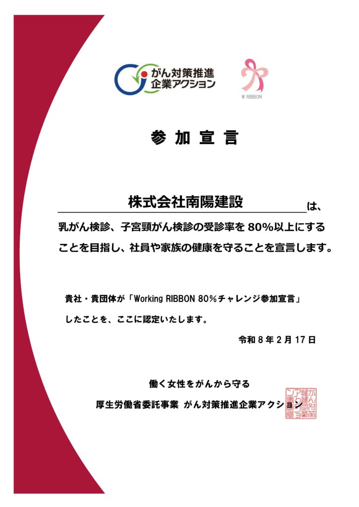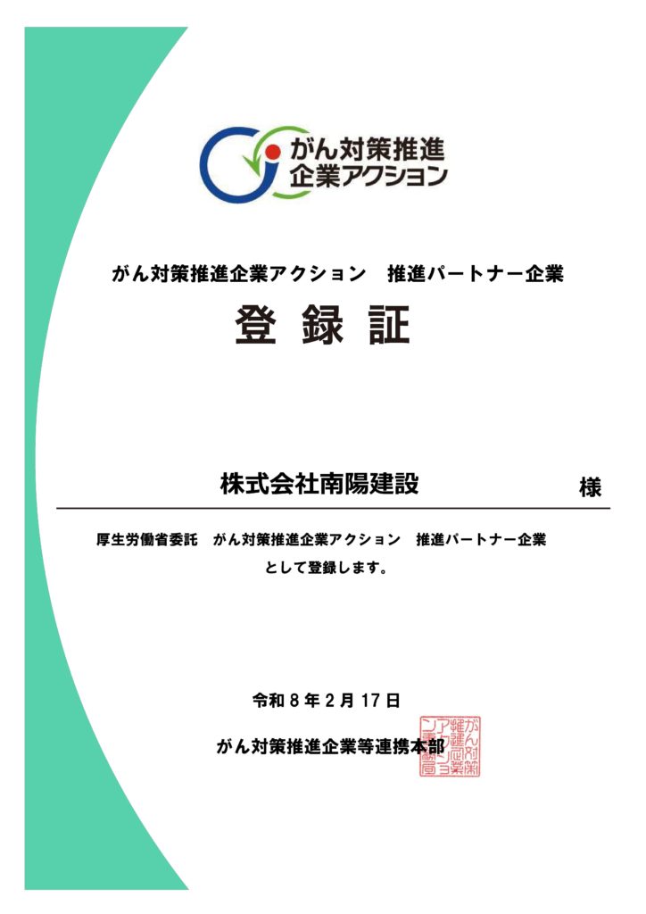 このたび南陽建設は、がん対策推進企業アクションの推進パートナーになりました。